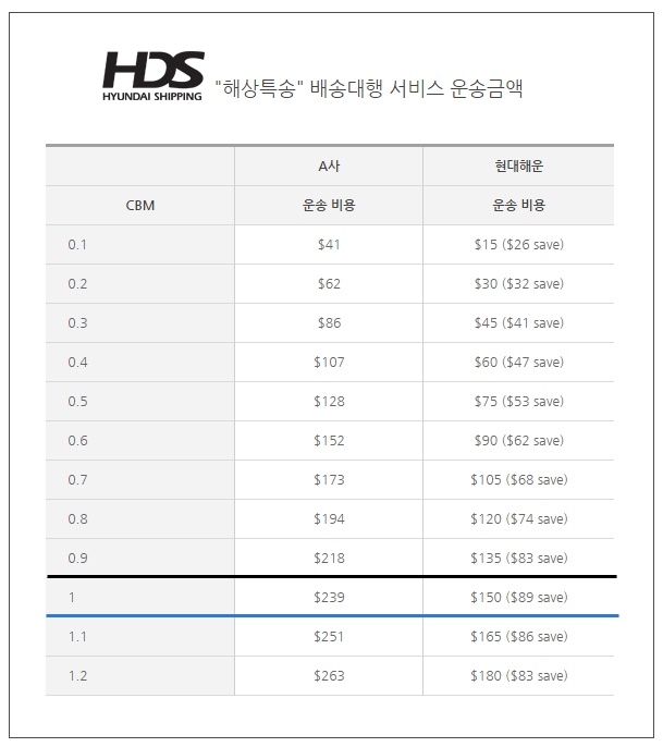 그는 이어 “해상운송 배송대행 사업을 진행하고 있는 기업은 다섯 손가락 안에 꼽힌다. 그 중에서도 해상운송 A사와 현대해운의 운송비를 비교해보면 1CBM(가로· 세로· 높이가 1m인 정사면체의 부피 단위) 당 $89의 가격 차이가 발생한다. 현대해운 요걸루 운송비가 이처럼 저렴하다”고 설명했다.