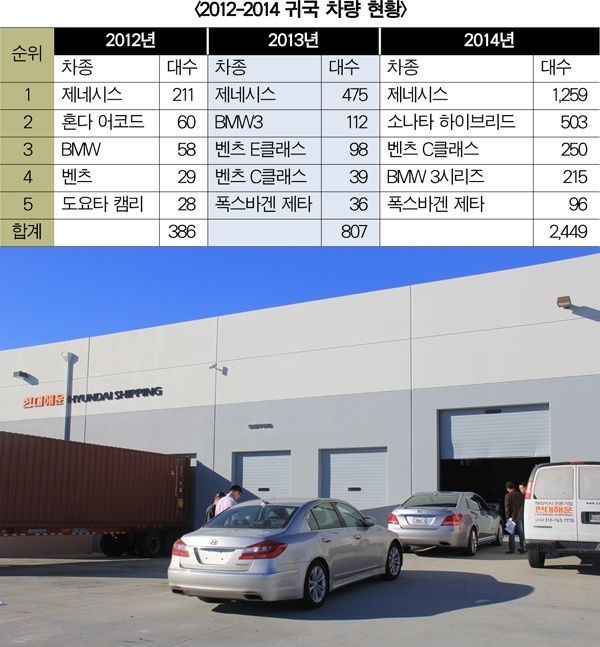 국제 이사전문 현대해운이 지난 3년간 집계한 귀국 차량 현황에 따르면 2012년 386대에서 올해 29일 현재 2,449대로 무려 534%가 늘어났다.